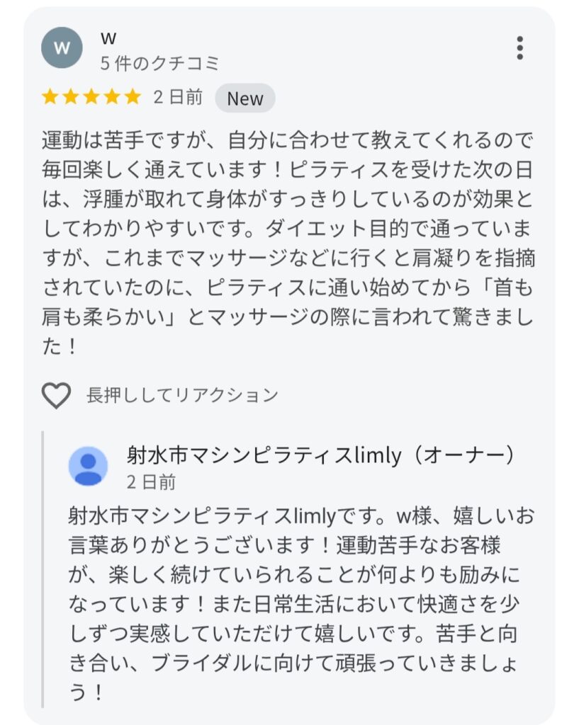以前より3㎏体重は増えているけど、マシンピラティスを続けていくうちに引き締まった今の体型の方がすきです。